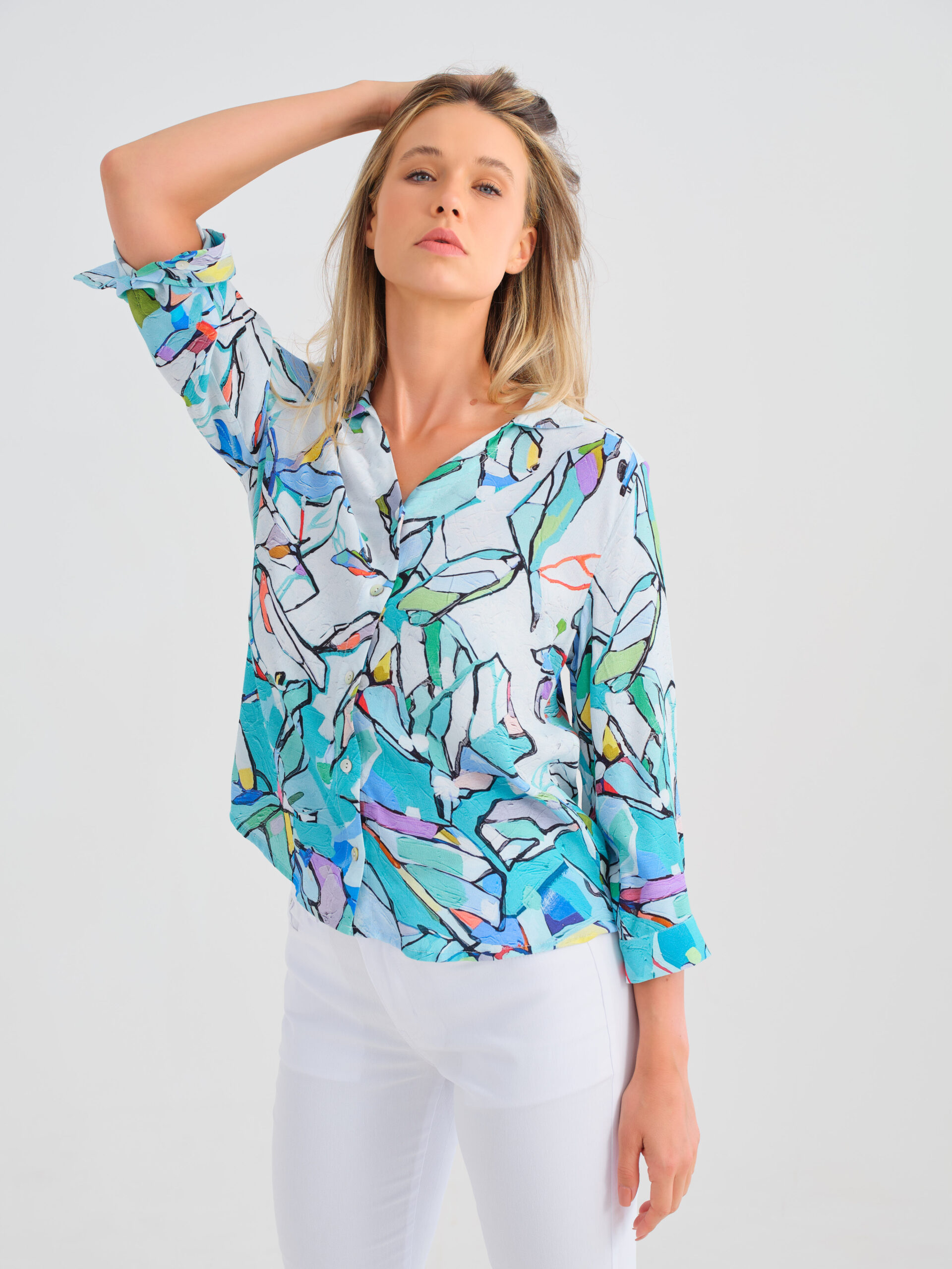 Chemisier imprimé boutonné, manches trois-quarts. col V.